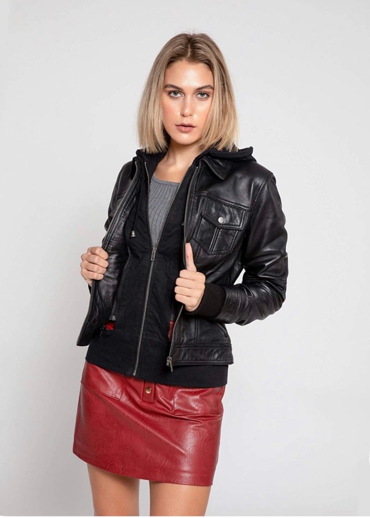 Womens leather jacket. Zippered mid-section. Removable mid section cotton fleece inner with hoodie. Four pockets: Two chest, Two side. Material: 100% Genuine leather Soft & Supple lambskin leather. This women’s leather jacket comes with a soft, and comfy fleece inner. Just throw this jacket on with its leather sexy leather exterior and soft interior and you won’t be disappointed. All seasons jacket. Two Front Snap Button Chest Pockets Two Lower Diagonal Zippered Hand Warmer Pockets Zippered Removable inner Mid-Section cotton with hoodie Stretchable ribbed cuffs Fully Lined with black polyester Satin Genuine YKK Zippers 100% Genuine Lambskin Regular Fit Model height is 5’8″ / 173cm and is wearing size US XS View Jacket Measurements Guide